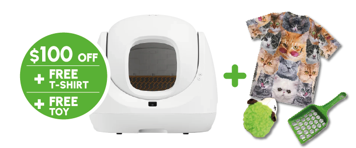 Save $100 on the Smartest Litter Box Ever and get a Free T-Shirt (for you) & a Toy (for your furry friend)
